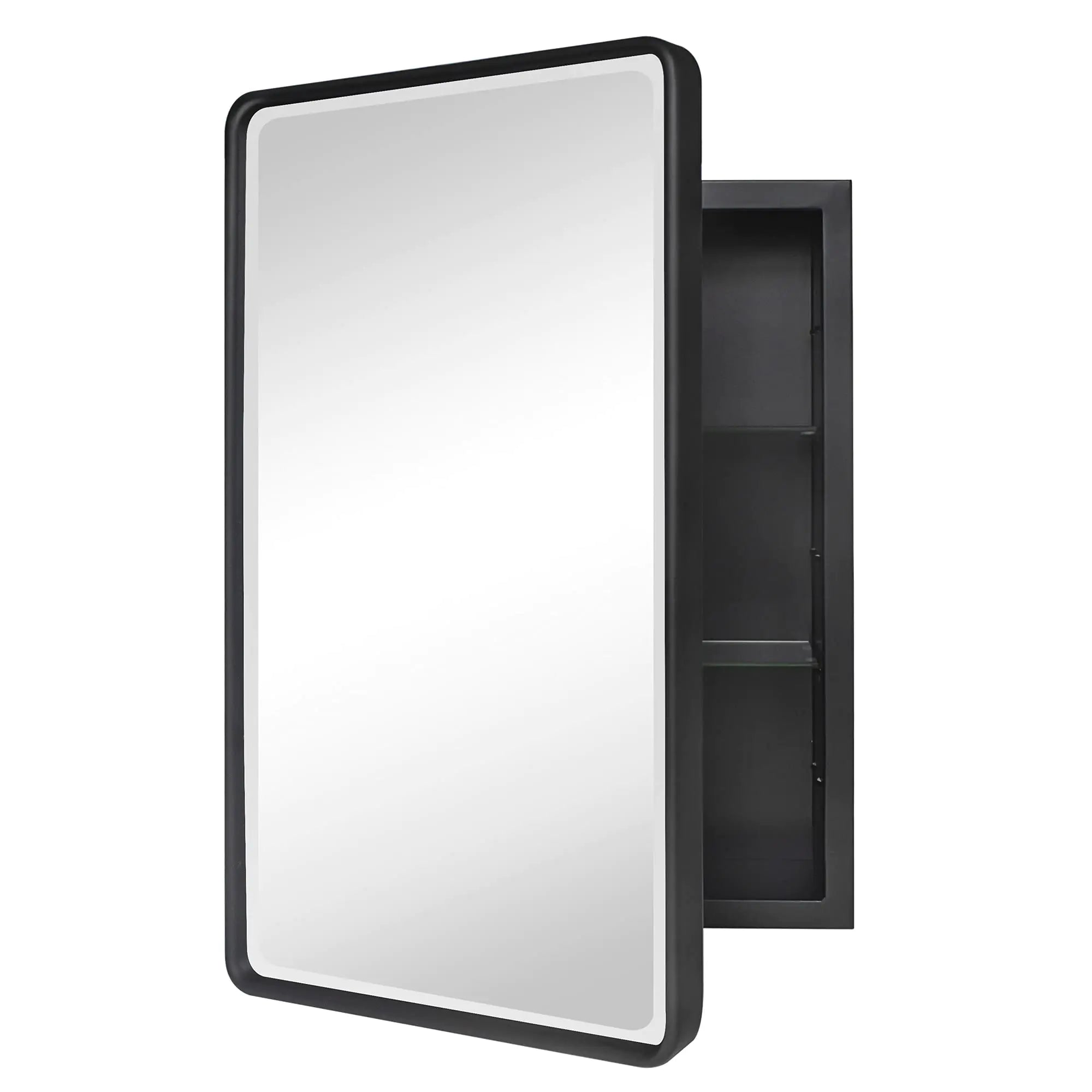 Farmhouse Black Metal Framed Recessed Bathroom Medicine Cabinet with Beveled Rounded Rectangle Mirror, 16" x 24" inches