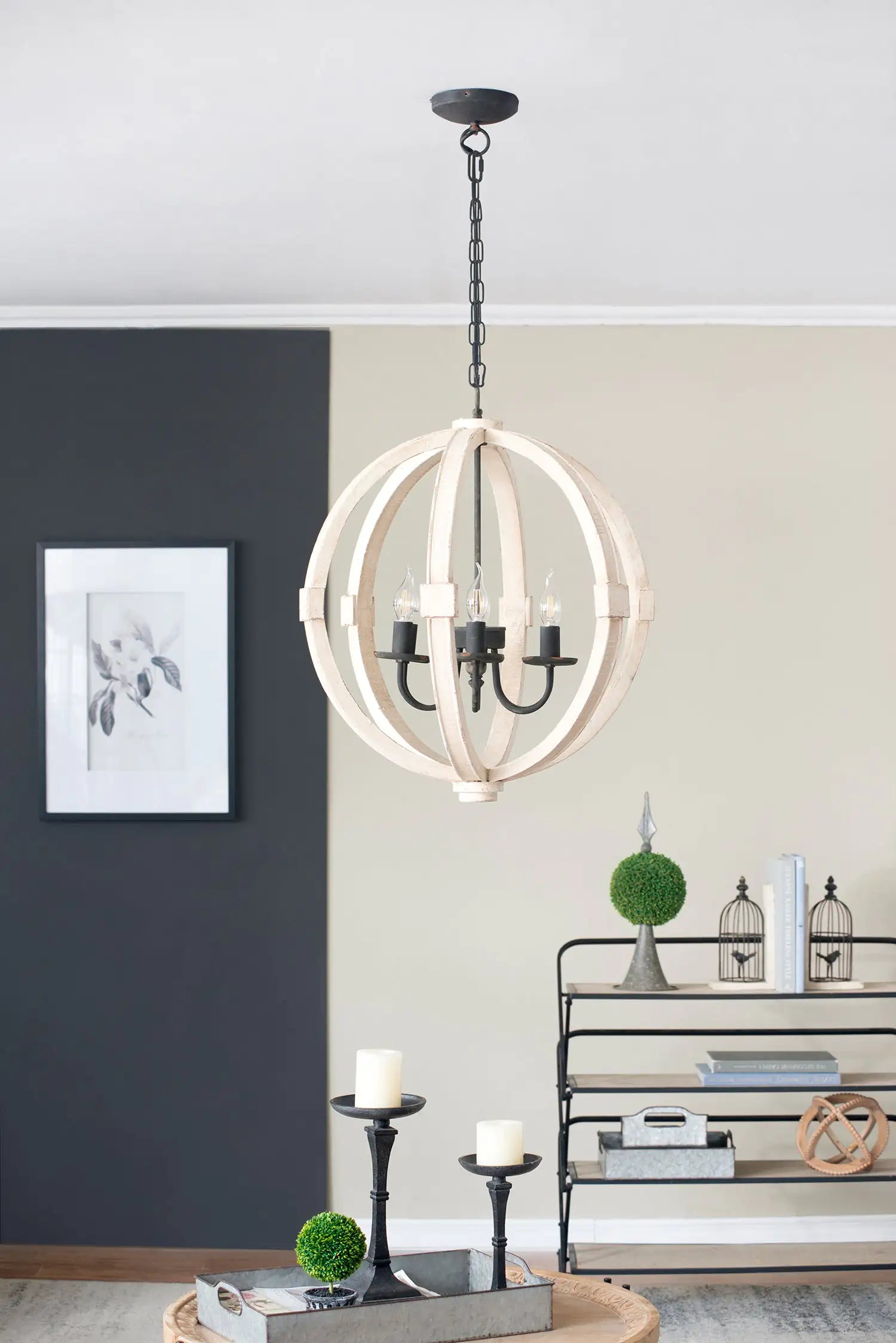 Add a warm, rustic touch to your home with this elegant 6-light wood chandelier. Featuring a distressed white pine finish and gracefully curved design, this fixture blends classic charm with modern simplicity. The contrasting iron accents add subtle character, making it a perfect centerpiece for your kitchen, dining room, foyer, or entryway.