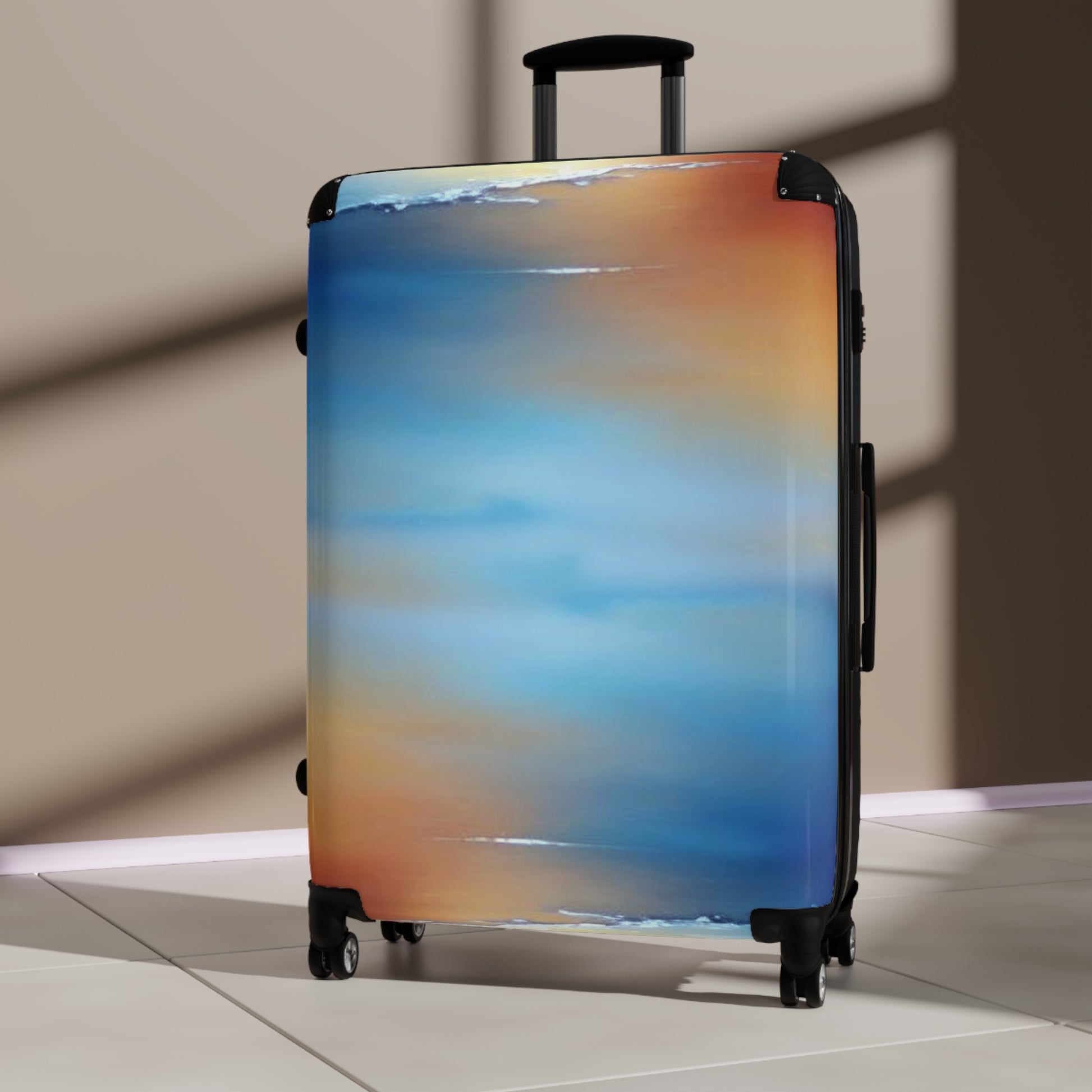 Blue Sea Red Orange Fog Large Suitcase with built in lock, 4 double-wheels, telescopic handle, and ABS back hard-shell