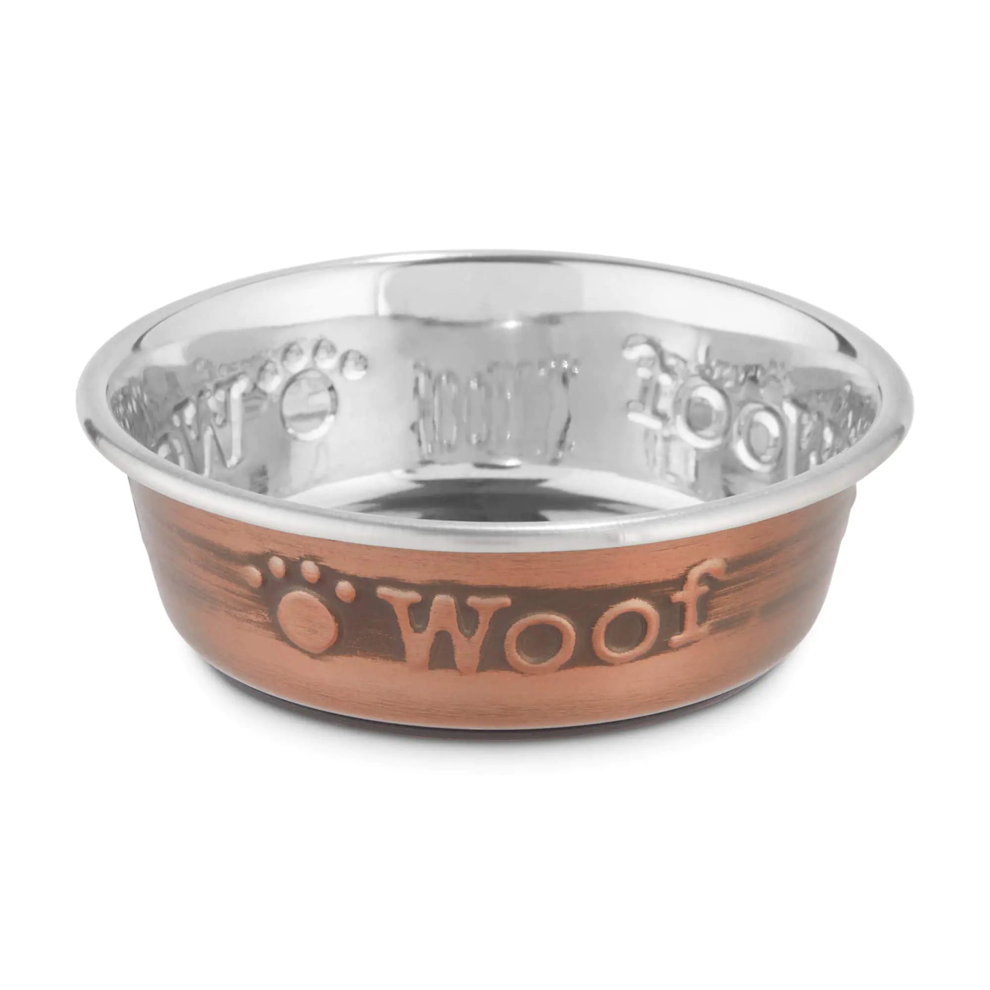 The EveryYay Copper Woof Stainless Steel Dog Bowl features a stylish brushed copper finish with a fun “Woof” and paw print design. It’s dishwasher-safe for easy cleaning and adds personality to your pup’s mealtime.
