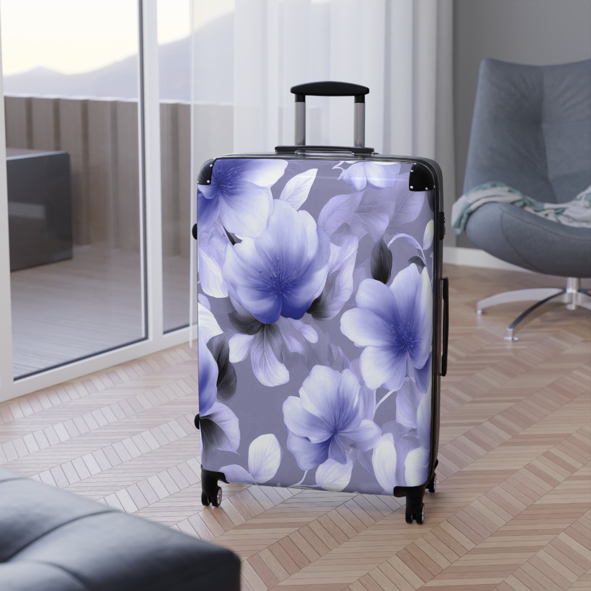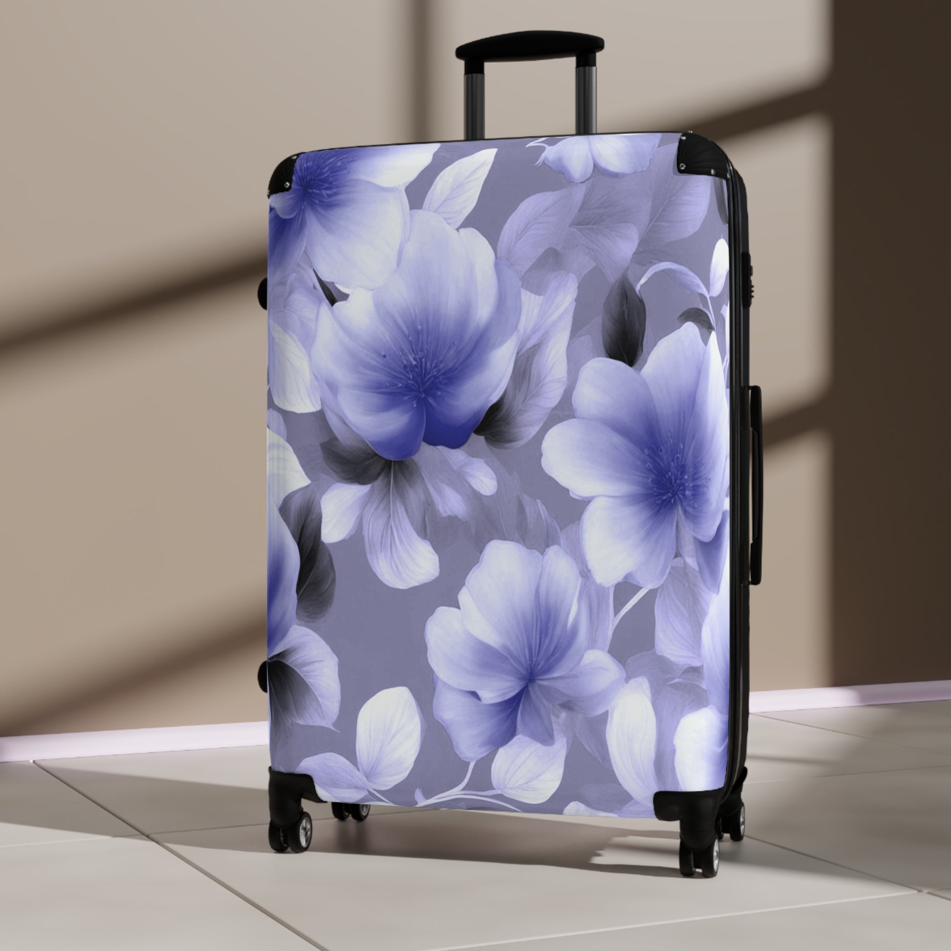 Indigo Blossom Floral Bunch Large Suitcase with built in lock, 4 double-wheels, telescopic handle, and ABS back hard-shell