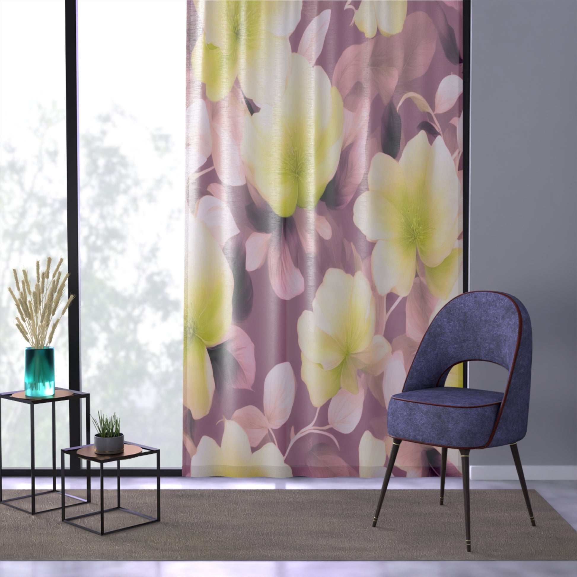 Lemon Blossom Floral Bunch Sheer Window Curtain, 50" x 84", partially transparent