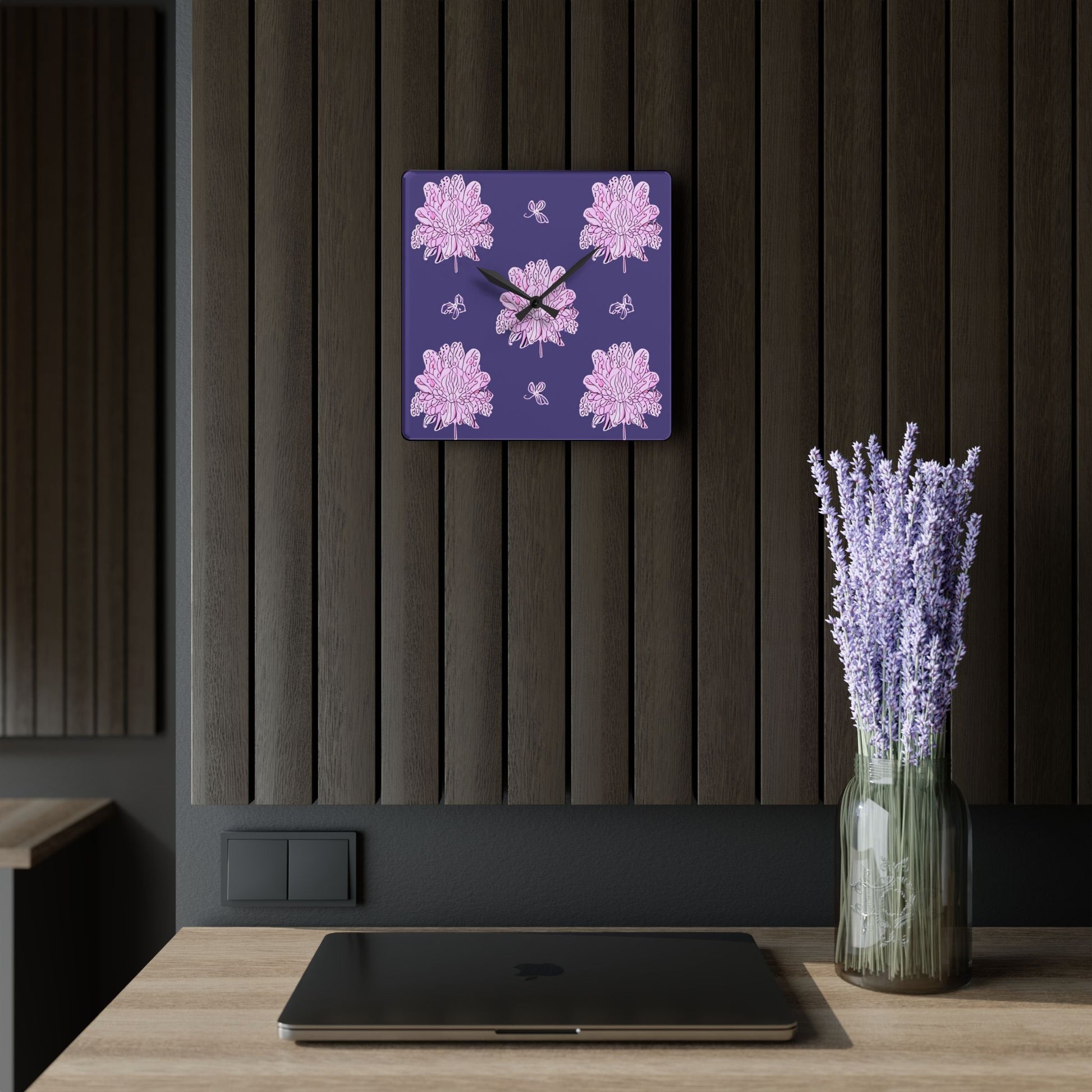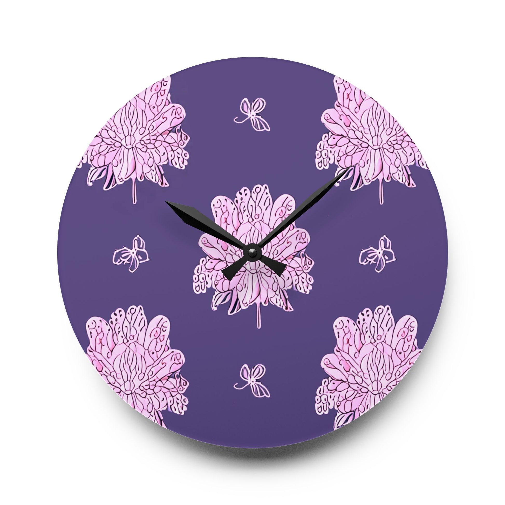 Magenta Floral Butterflies Acrylic Wall Clock, Round or Square, 10.75" x 10.75"