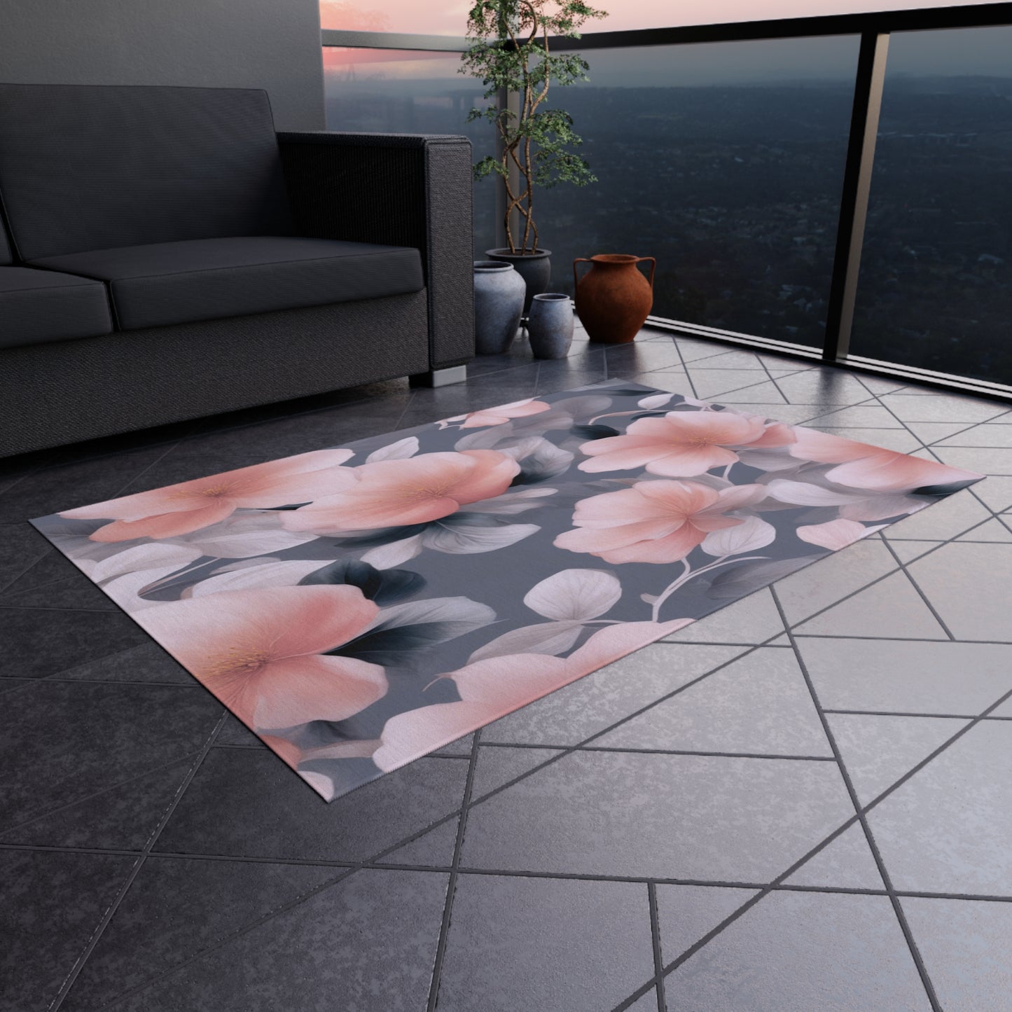 Peach and Blue Gray Floral Bunch Outdoor Rug, 48" x 72"
