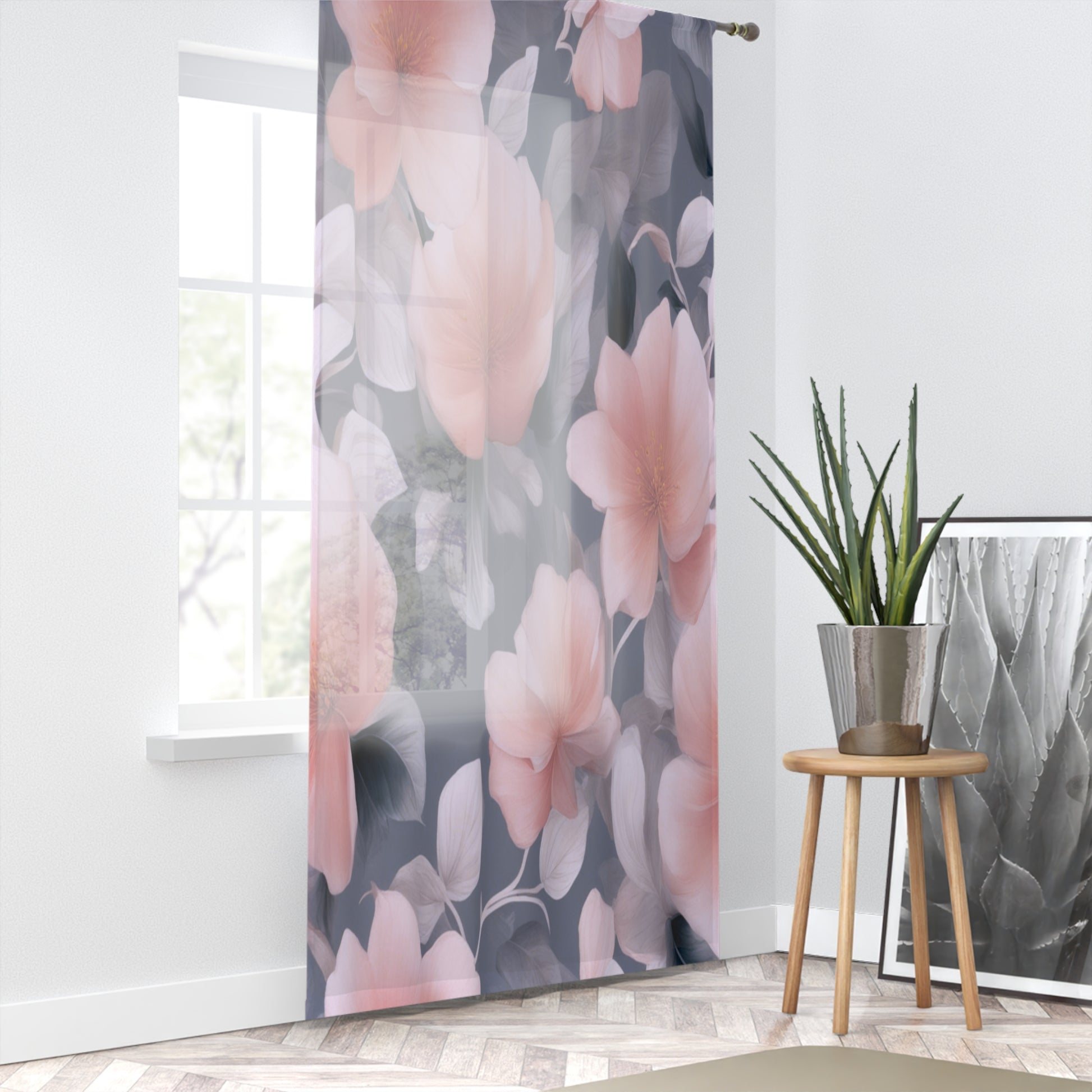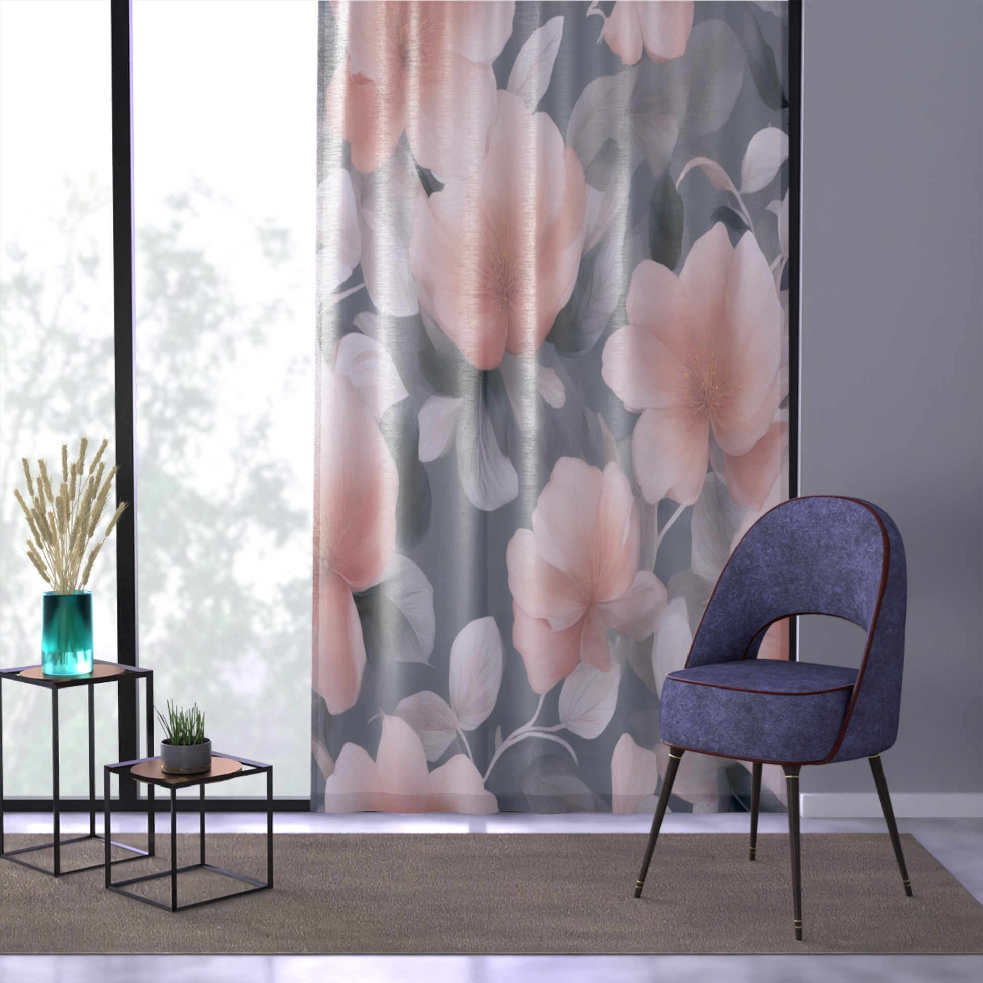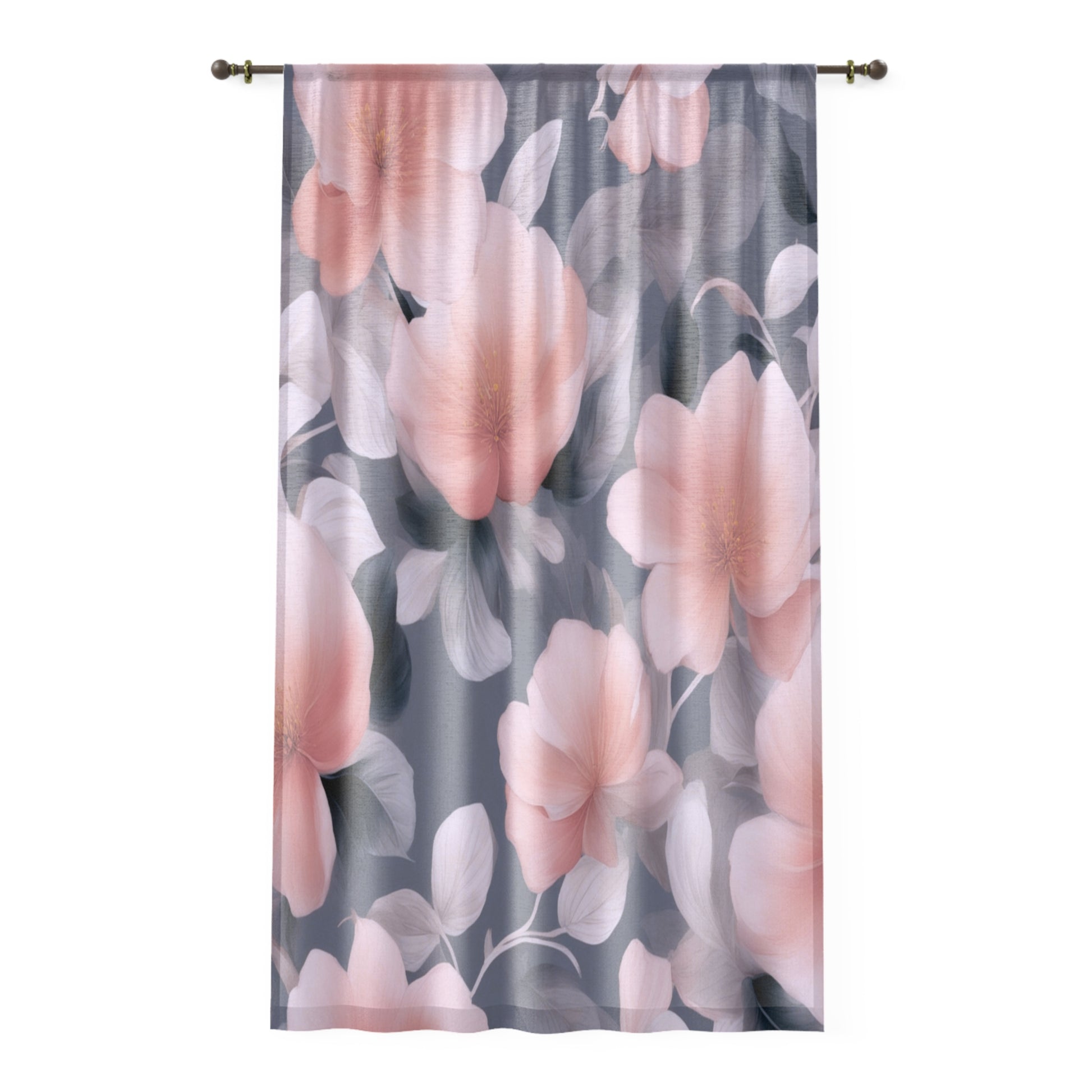 Peach and Blue Gray Floral Bunch Sheer Window Curtain, 50" x 84", partially transparent