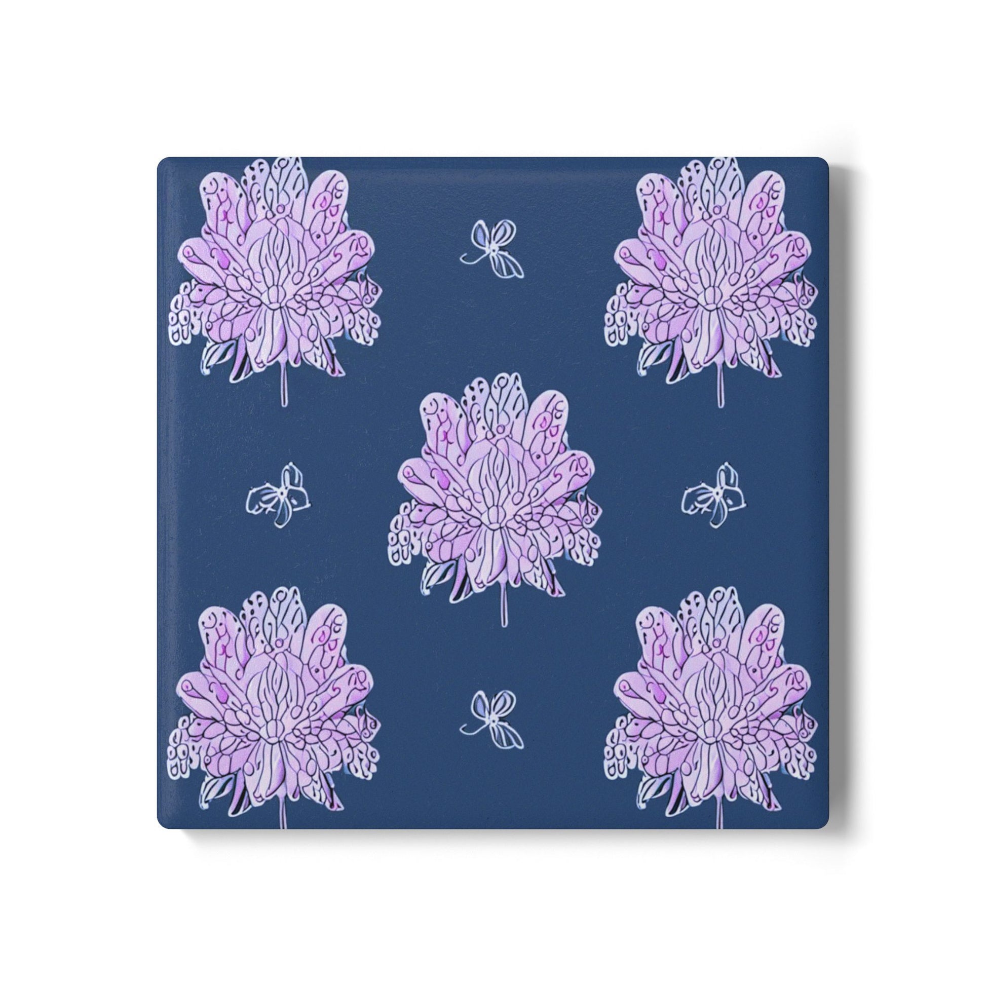Purple White Floral Butterflies 4" x 4" Square Ceramic Coaster