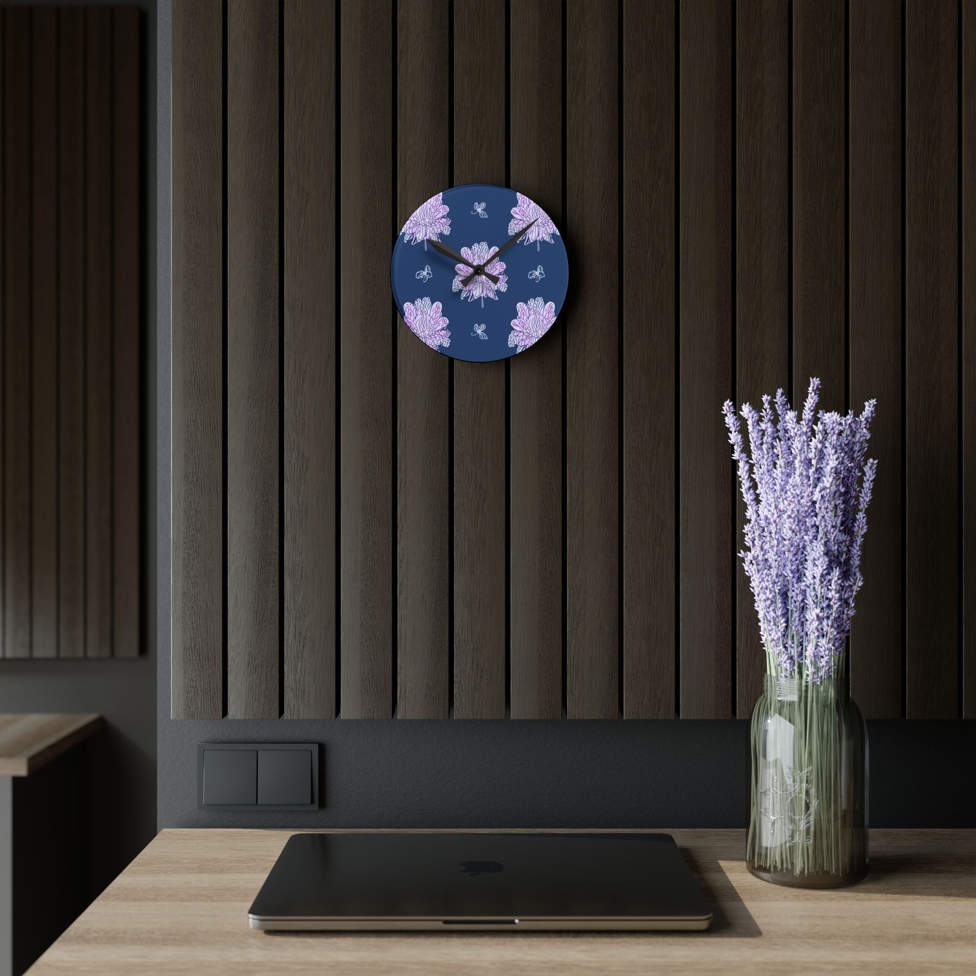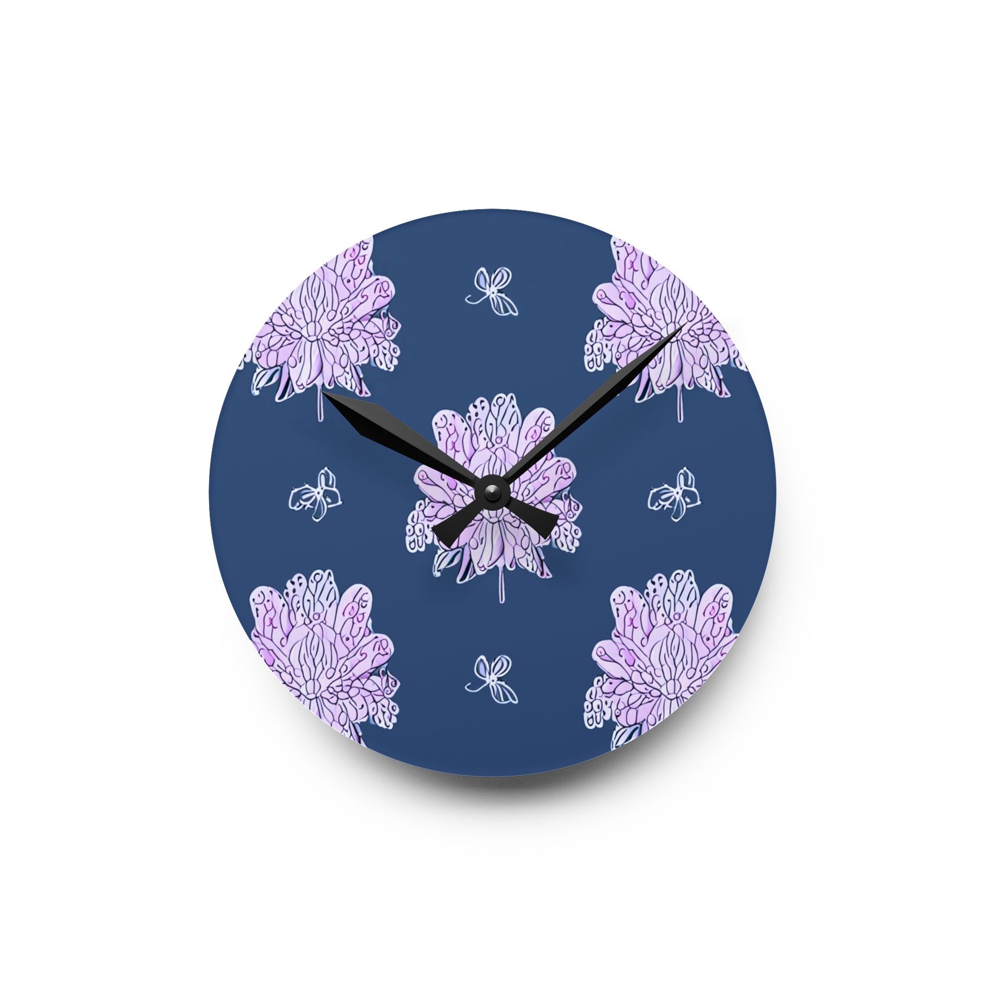 Purple White Floral Butterflies Acrylic Round Wall Clock, 8" x 8"