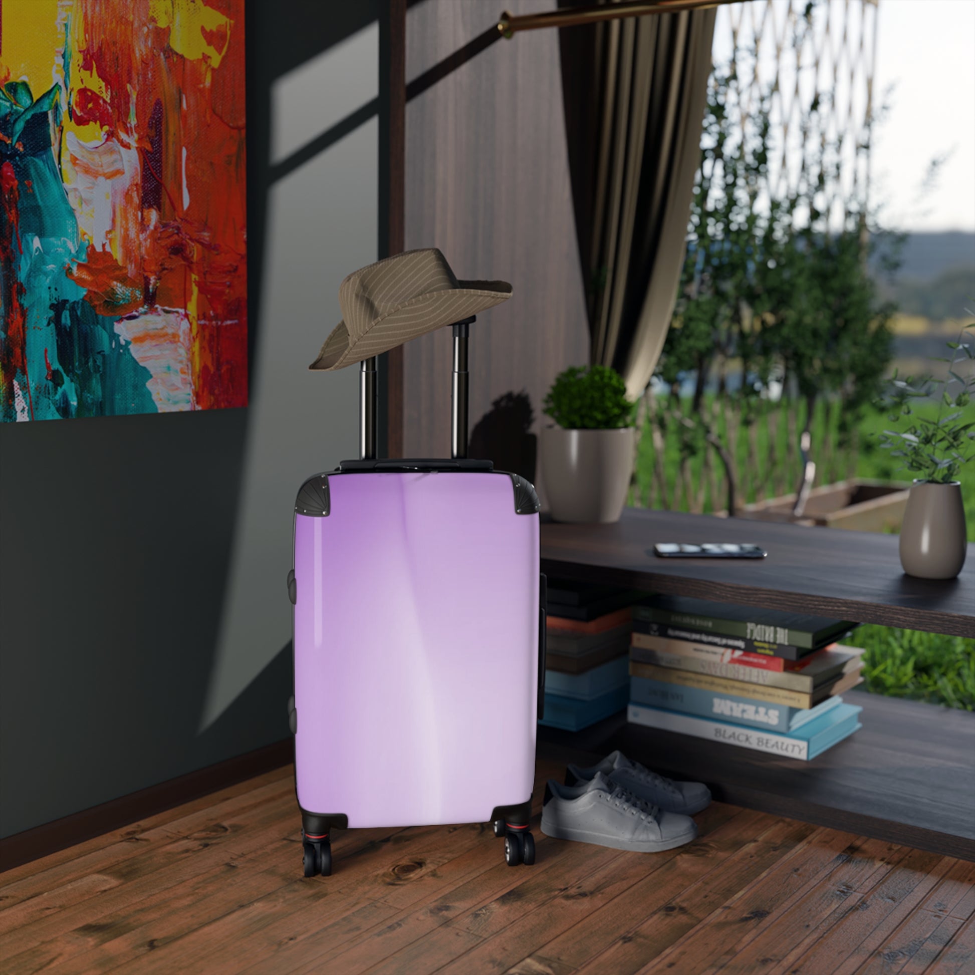 Soft Lavender Fade Small Suitcase with built in lock, 4 double-wheels, telescopic handle, and ABS back hard-shell