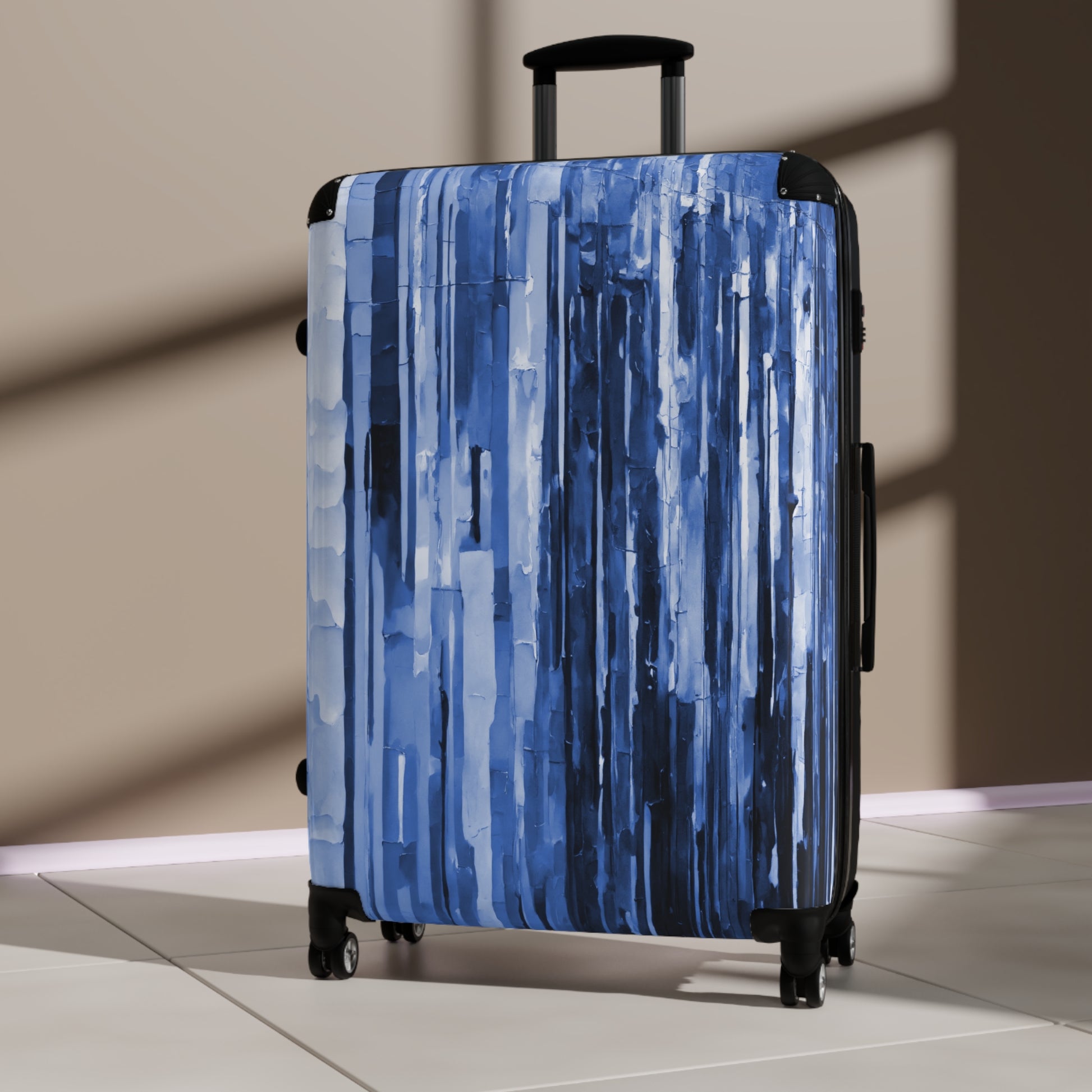Striped Deep Blue Large Suitcase with built in lock, 4 double-wheels, telescopic handle, and ABS back hard-shell