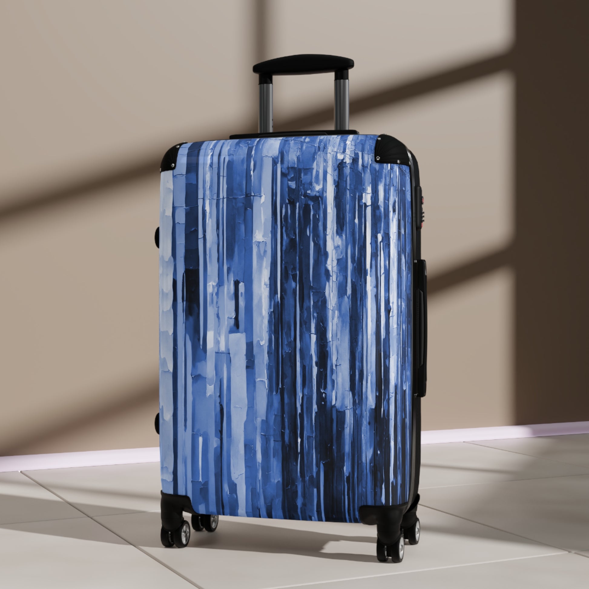 Striped Deep Blue Medium Suitcase with built in lock, 4 double-wheels, telescopic handle, and ABS back hard-shell