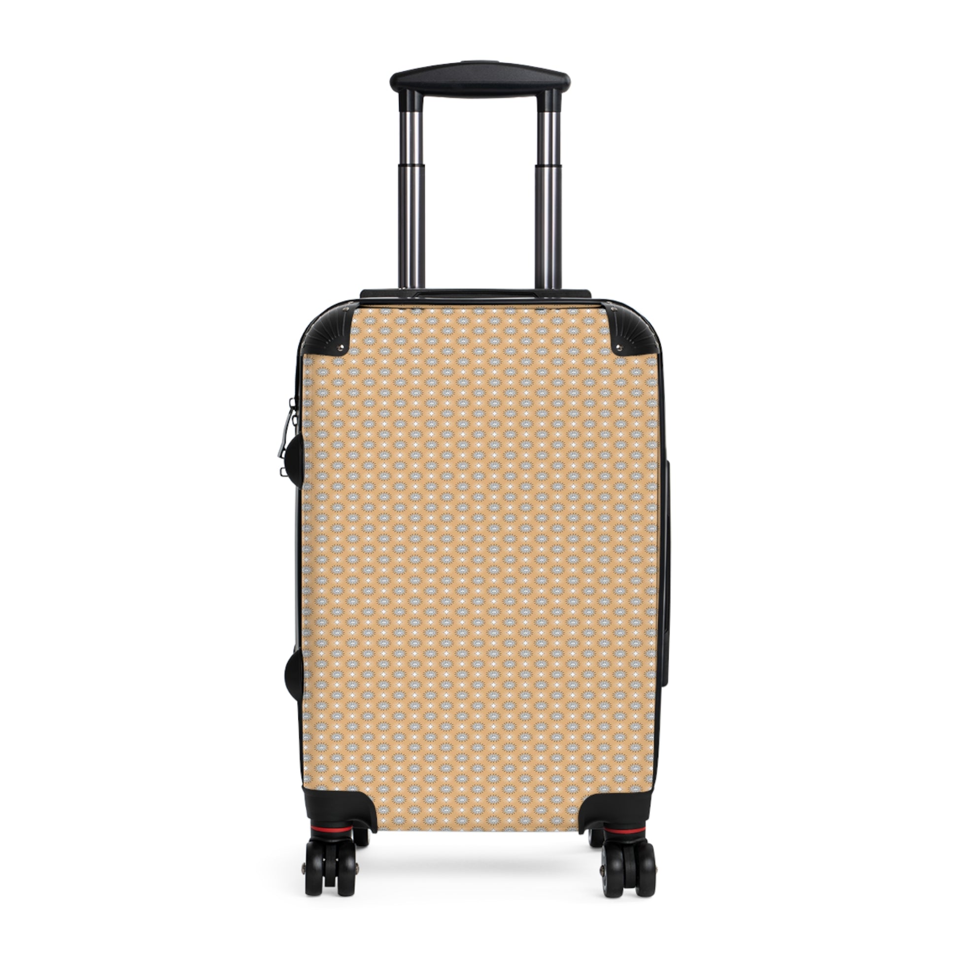 Tan Sunset Star-crossed Bodies Small Suitcase with built in lock, 4 double-wheels, telescopic handle, and ABS back hard-shell