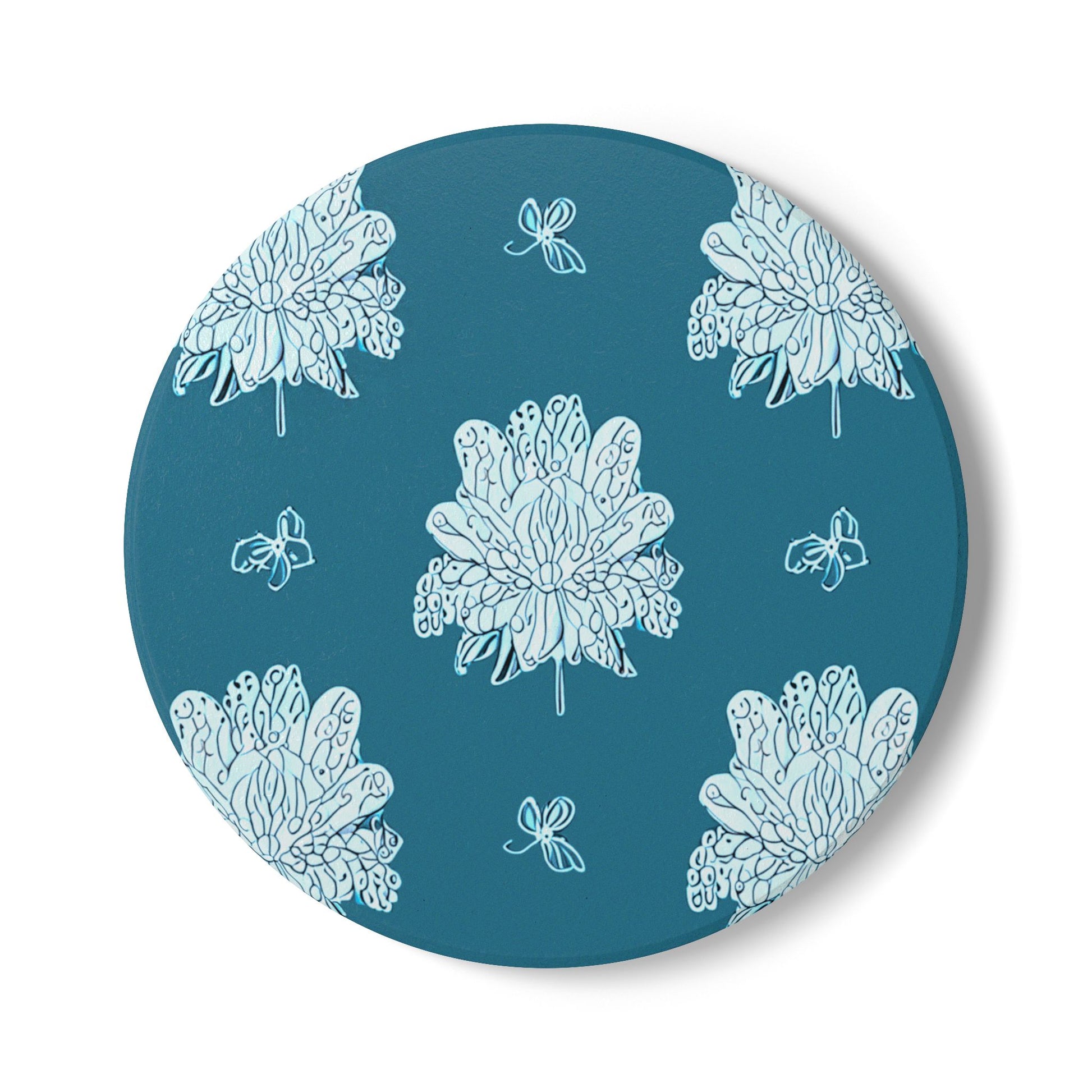 Tif Green White Floral Butterflies 4" x 4" Round Ceramic Coaster