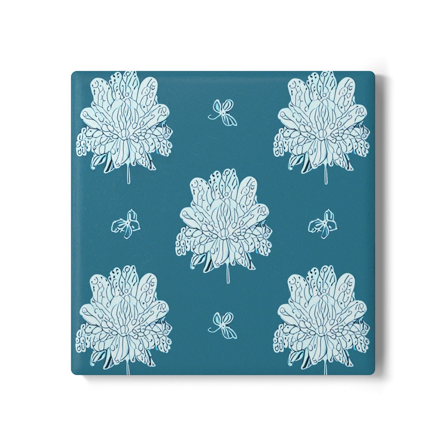 Tif Green White Floral Butterflies 4" x 4" Square Ceramic Coaster