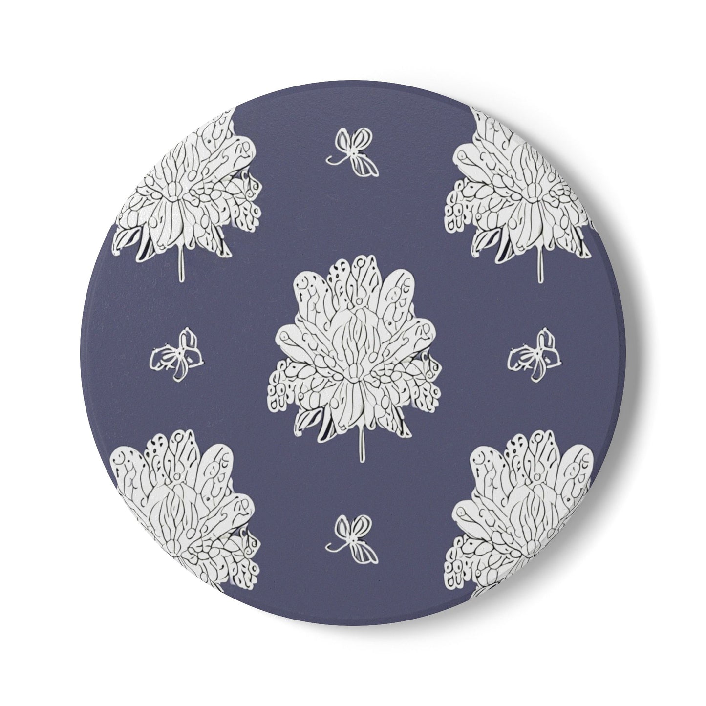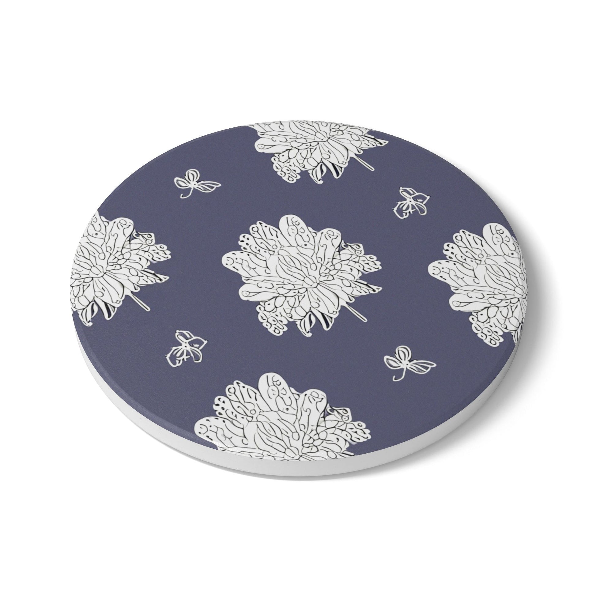 White Floral Butterflies 4" x 4" Round Ceramic Coaster